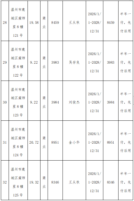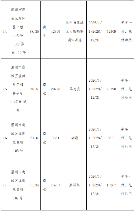 我公司位于虞师里6幢蝉河66-3、蝉河67号等35宗资产叁年租赁权在2025年12月23日至2025年12月29日进行公开招租,经评估机构评估、委托温州联合产权交易中心拍卖及公开竞价并按相关程序审批,现已完成公开拍卖,现将拍卖结果公示如下: