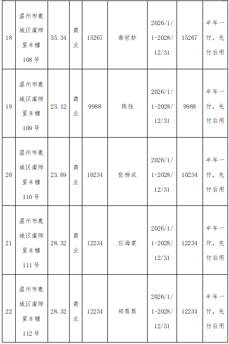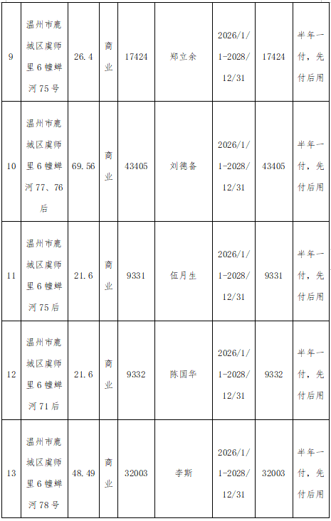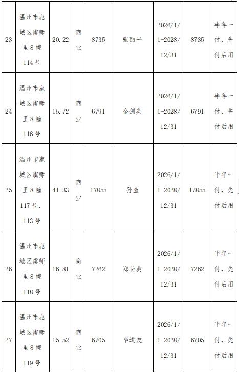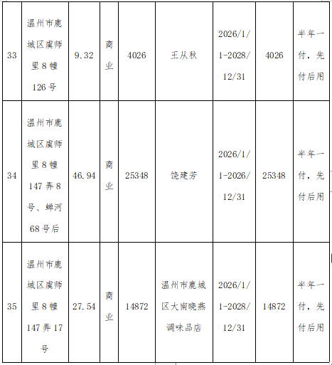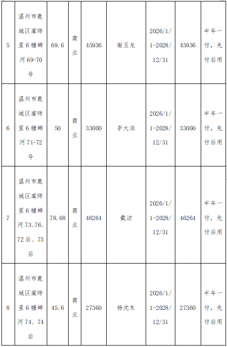 我公司位于虞师里6幢蝉河66-3、蝉河67号等35宗资产叁年租赁权在2025年12月23日至2025年12月29日进行公开招租,经评估机构评估、委托温州联合产权交易中心拍卖及公开竞价并按相关程序审批,现已完成公开拍卖,现将拍卖结果公示如下: